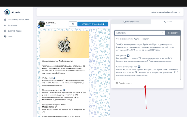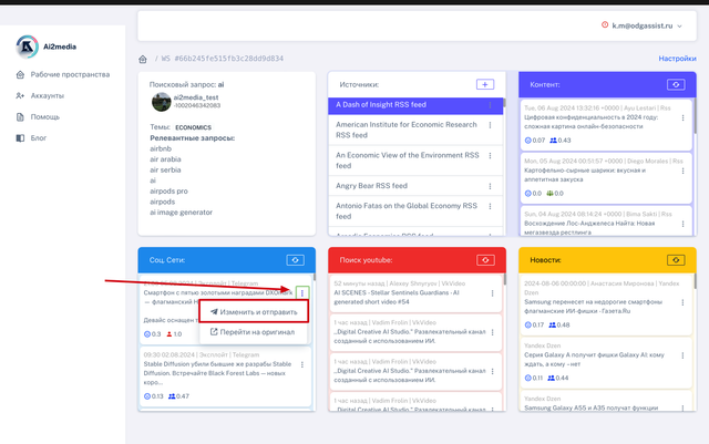 После получения данных из различных источников по поисковому слову и категориям выбираем наиболее интересный пост и нажимаем рядом на "Три точки". В выпадающем списке можем перейти и изучить оригинал новости, а также ее отредактировать. Нажимаем "Изменить и отправить".