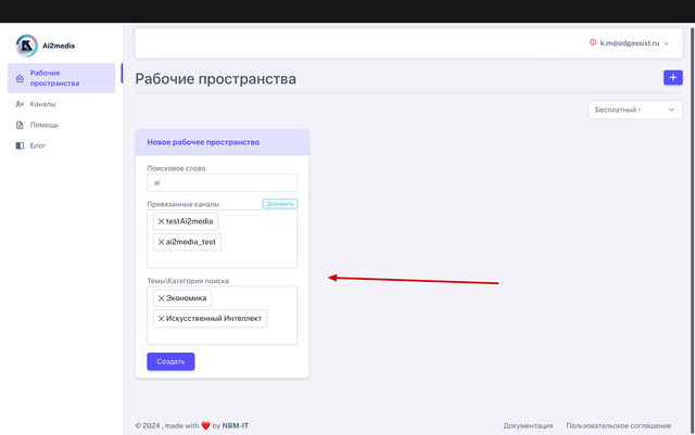 Чтобы создать рабочее пространство переходим в раздел "Рабочие пространства" и заполняем форму "Новое рабочее пространство":
