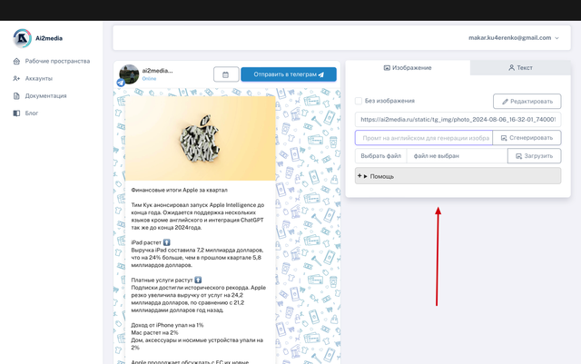 Если Вы указали несколько привязанных каналов при создании пространства, то нужно выбрать целевой канал, нажав на стрелочку рядом с названием канала