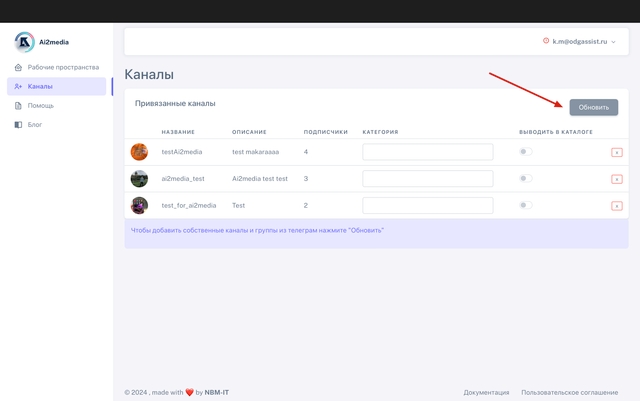 Чтобы добавить собственные группы/каналы из телеграм необходимо перейти в раздел "Каналы" и нажать на кнопку "Обновить", также если Вы делаете это впервые, нужно привязать свой телеграм аккаунт. В дальнейшем для актуализации данных привязанных каналов/групп нужно нажимать ту же кнопку "Обновить".
