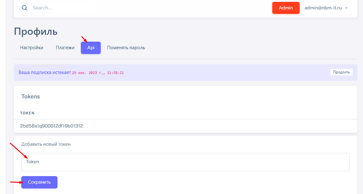 Переходим в раздел API и добавляем token, который Вам отдал плагин на Wordpress и нажимаем сохранить