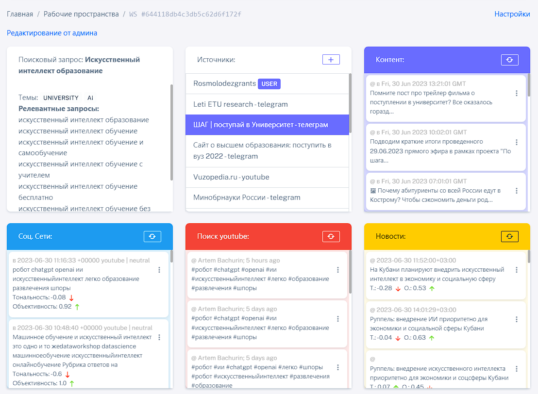 Рабочее пространство (workspace) это основа для взаимодействия с интерфейсом платформы. Каждый workspace обслуживает один запрос и несколько категорий (тем) в зависимости от тарифа.