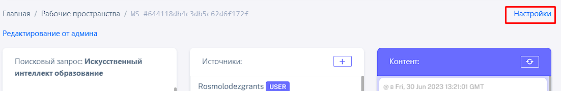 Чтобы создать рабочее пространство необходимо выбрать поисковое слово и тему поиска. И настроить источники экспорта по необходимости.